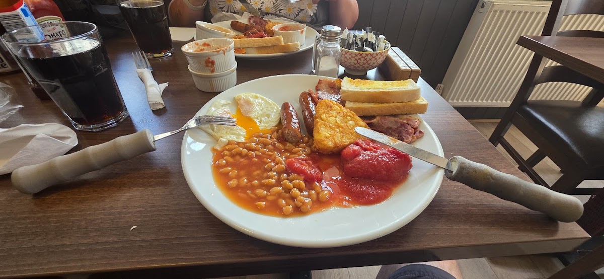 Popular cafe centrally located. Extensive menu particularly strong on all day breakfast including build your own at £1 an item. Quick service, pleasant staff. Good tea and coffee. Very reasonable prices. Would definitely go back. There is a large seating area through the back so check for free tables there. Only negative they keep back door open to cool kitchen down but cold to sit near it even though they said we could close if we needed to.
